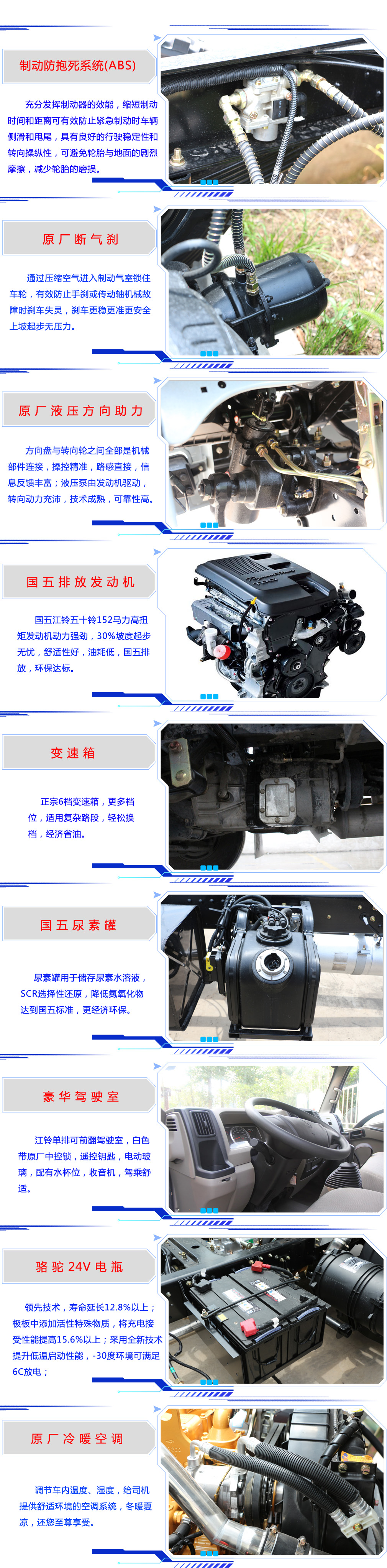 | 其他 | 随底盘选装左右外后视镜,两种外后视镜仅镜杆长度不同。选装前雾灯。短镜杆后视镜,不装前雾灯外观见选装照片。侧防护装置材料材质:Q235,连接方式:焊接加螺栓连接。后防护用后部专用装置替代,离地高490mm。ABS系统型号:VIE ABS-II,ABS系统生产厂家:上海万捷汽车控制系统有限公司。 | ||