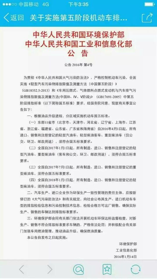 為貫徹《中華人民共和國大氣污染防治法》,嚴(yán)格控制機(jī)動(dòng)車污染,全面實(shí)施《輕型汽車污染物排放限值及測量方法(中國第五階段)》(GB18352.5-2013)和《車用壓燃式、氣體燃料點(diǎn)燃式發(fā)動(dòng)機(jī)與汽車排氣污染物排放限值及測量方法(中國Ⅲ、Ⅳ、Ⅴ階段)》(GB17691-2005)中第五階段排放標(biāo)準(zhǔn)(以下簡稱國五標(biāo)準(zhǔn))要求,經(jīng)國務(wù)院同意,現(xiàn)就有關(guān)事宜公告如下: