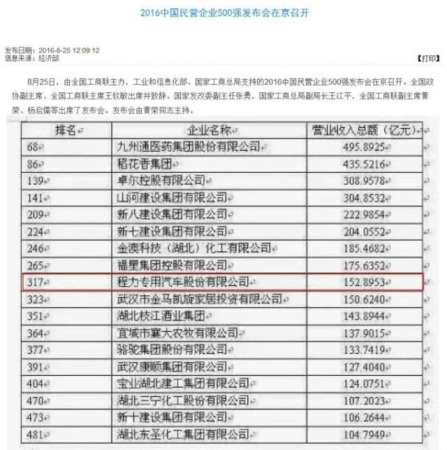 8月25日,全國工商聯(lián)發(fā)布“2016中國民營企業(yè)500強(qiáng)”榜單,華為以3950.09億元的年?duì)I收成為500強(qiáng)榜首。18家鄂企入圍(2015年16家),數(shù)量并列全國第五,位居中部第一。隨州的程力專用汽車股份有限公司以152.8953億元的營業(yè)收入全國排名317位,在湖北排名第9位。